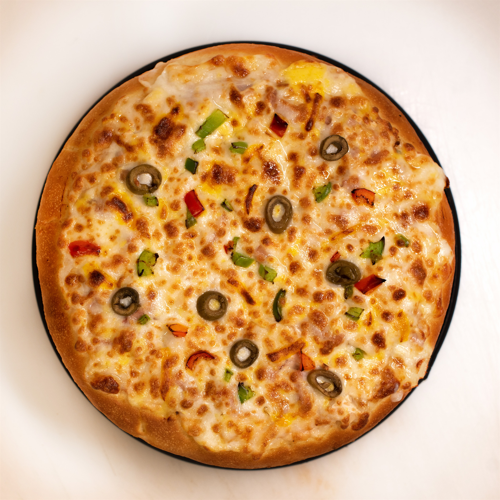 خمیر پیتزا کلاسیک، مرغ مزه دار شده، قارچ، زیتون سیاه، سس مخصوص آلفردو، فلفل دلمه رنگی، 4 نوع پنیر مخصوص