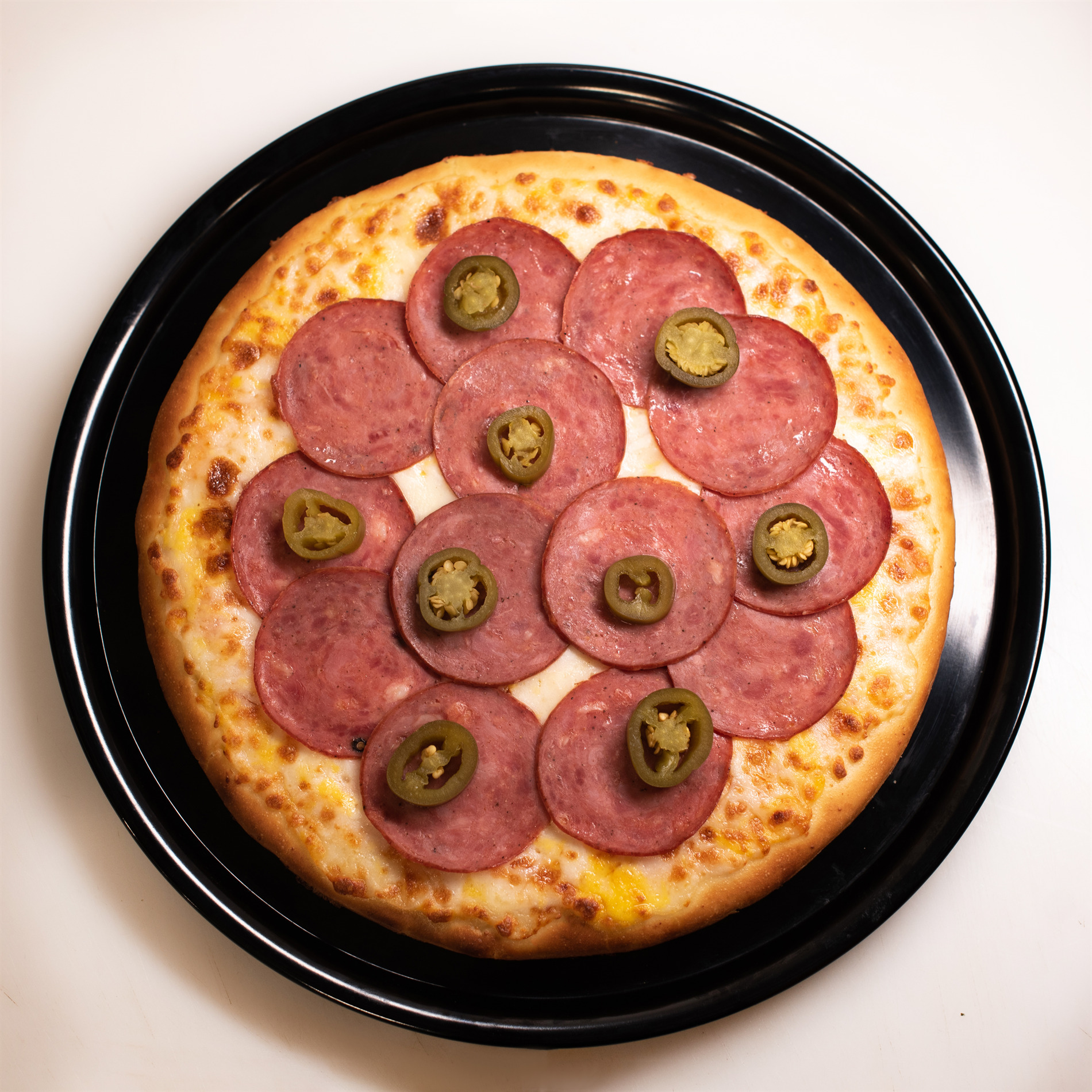 خمیر پیتزا ایتالیایی، پپرونی 70%، قارچ بلنچ، سس مخصوص، فلفل هالوپینو، 4 نوع پنیر مخصوص