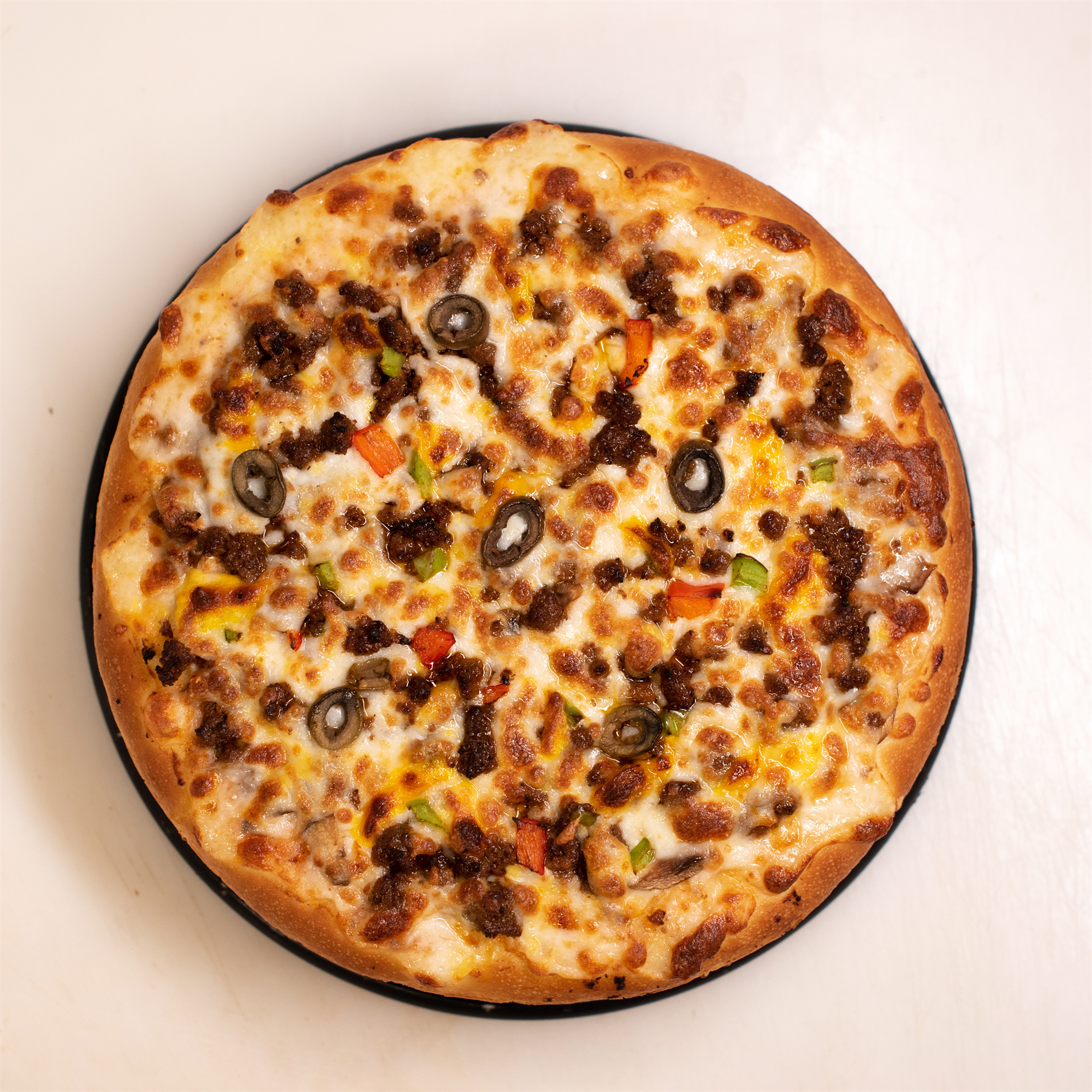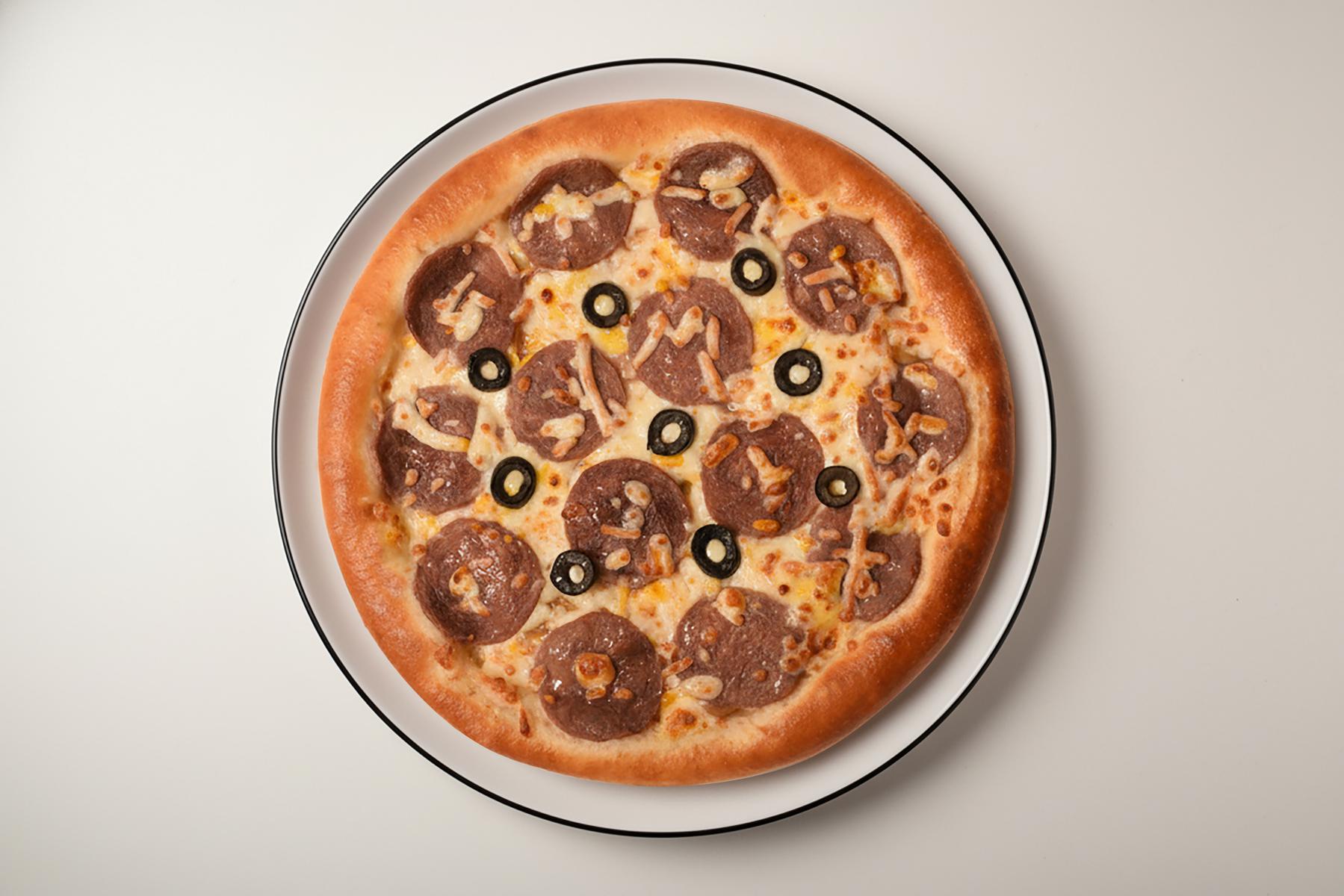 خمیر پیتزا کلاسیک، سوسیس گوشت 80%، قارچ، فلفل دلمه ای، زیتون، 4 نوع پنیر پیتزای مخصوص