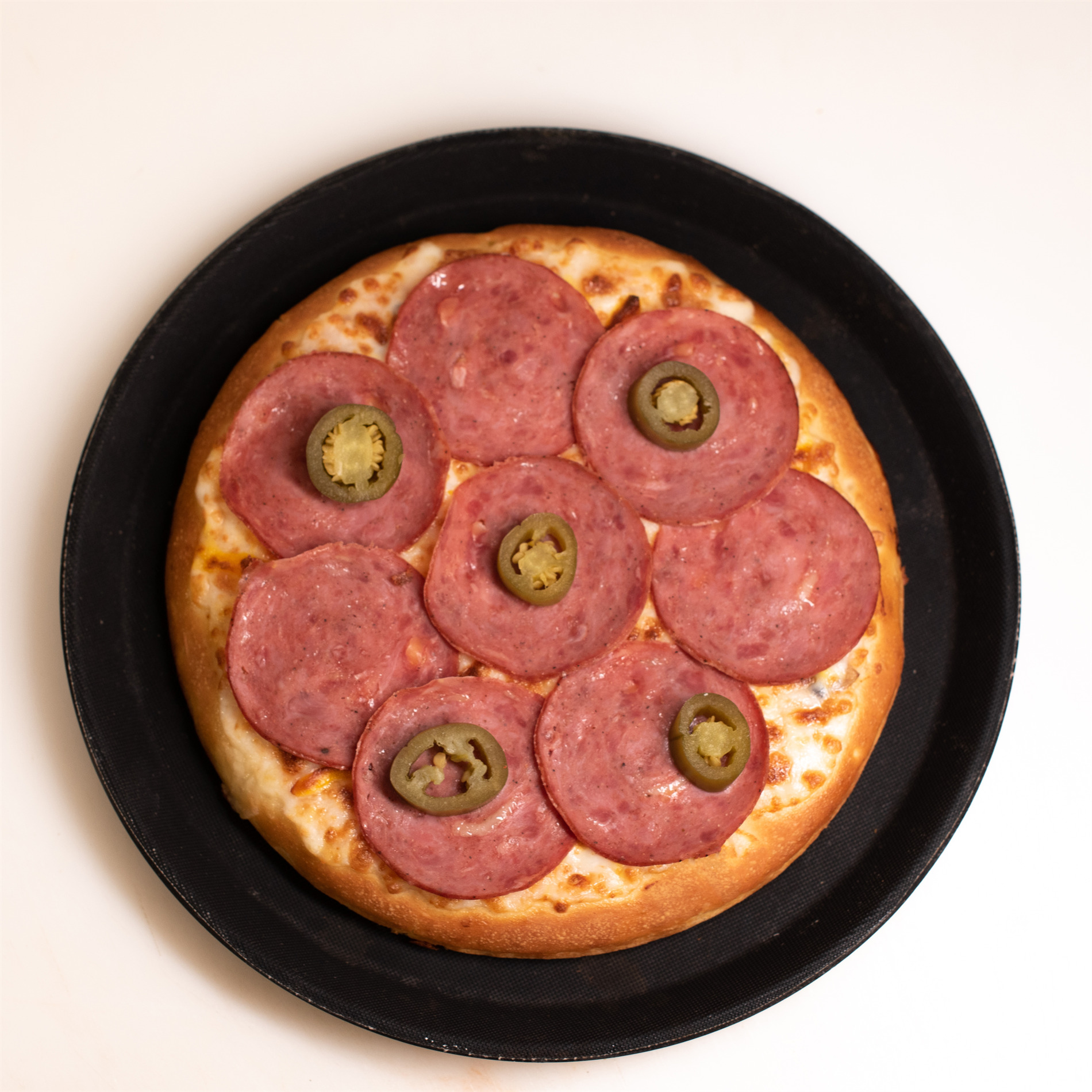 خمیر پیتزا، پپرونی 70%، قارچ، پنیر پیتزا، فلفل هالوپینو