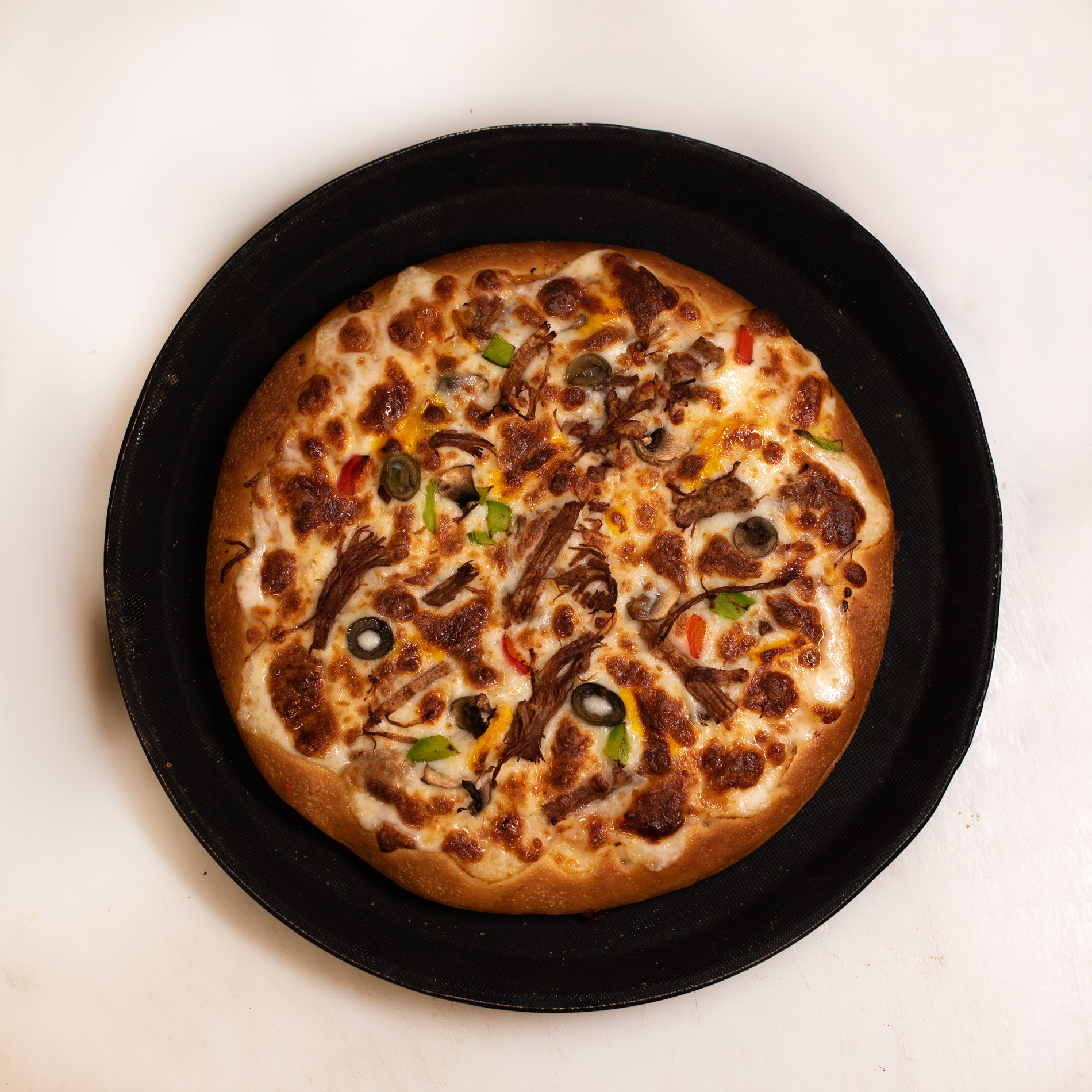 خمیر پیتزا کلاسیک، گوشت گوساله رست شده، قارچ، فلفل دلمه ای رنگی، زیتون سبز، 4 نوع پنیر مخصوص