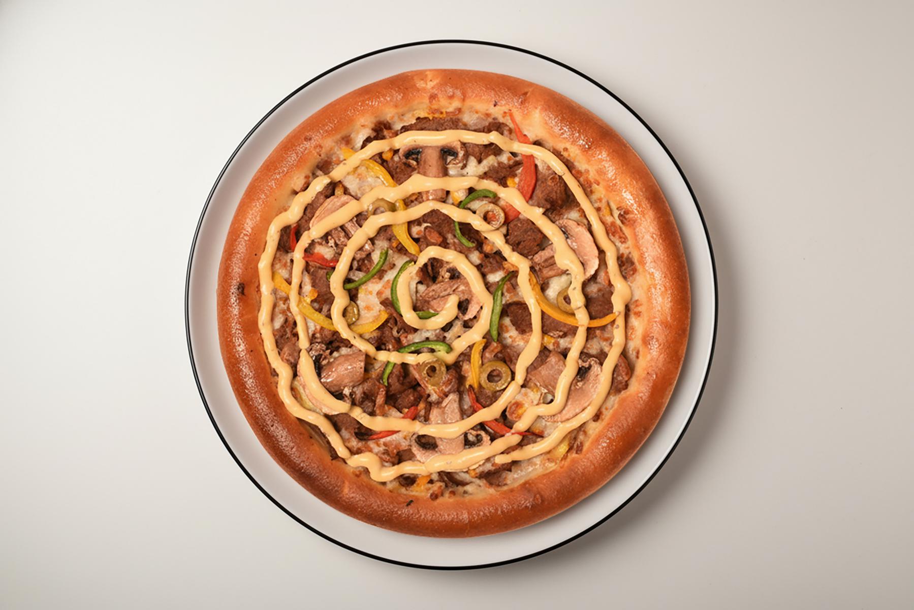 خمیر پیتزا کلاسیک، گوشت استیک گوساله، سس سیر، قارچ بلنچ، زیتون، 4 نوع پنیر مخصوص